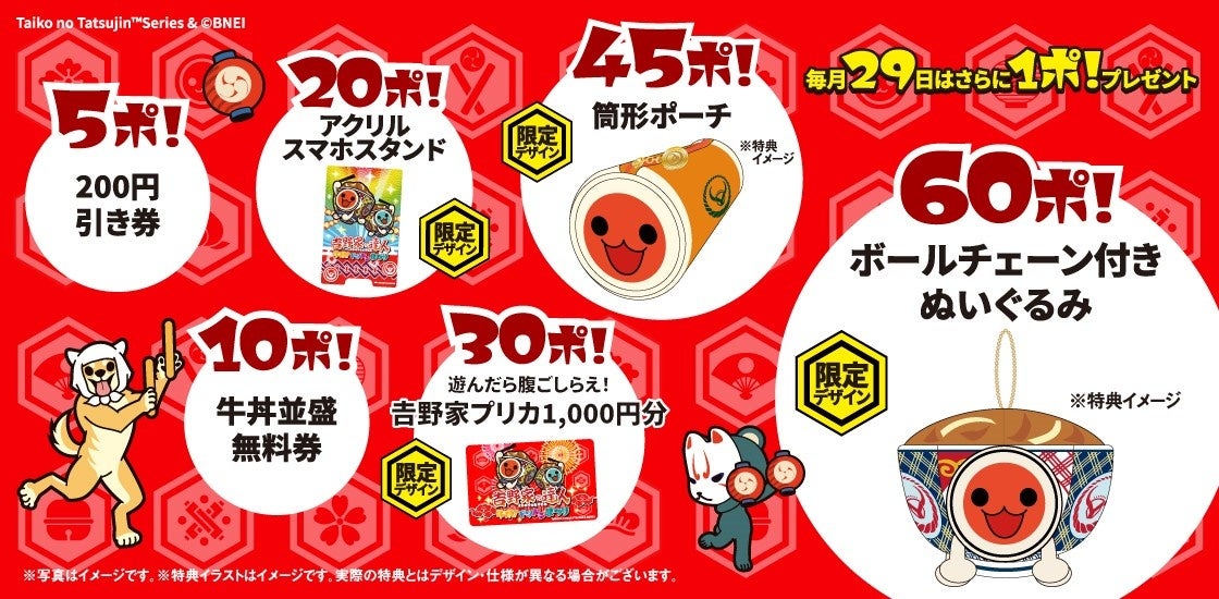 吉野家の牛ポ!で500円ごとにポイントが貰える。200円引き券や並盛無料券、プリカなどと交換可能。7/31 11時~11/7 20時。