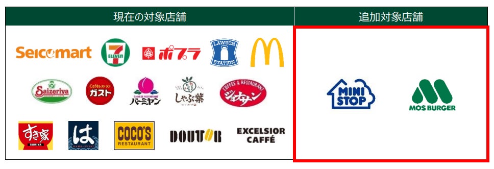 ミニストップとモスバーガーを新たに追加しました。
