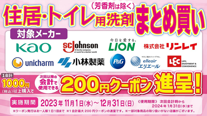 サンドラッグで花王やジョンソン、ライオンの住居・トイレ用洗剤まとめ買いで200円分クーポンが貰える。~12/31。