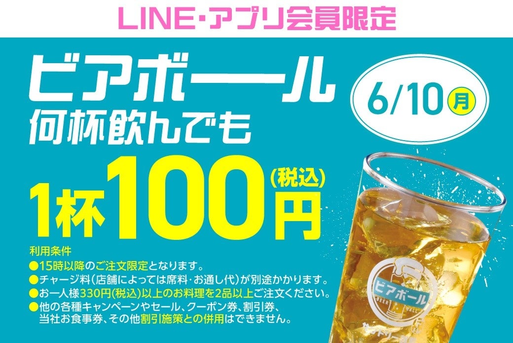 6月10日(月)一日限定で、サントリー“ビアボール”を何杯でも1杯100円(税込)で提供されます。