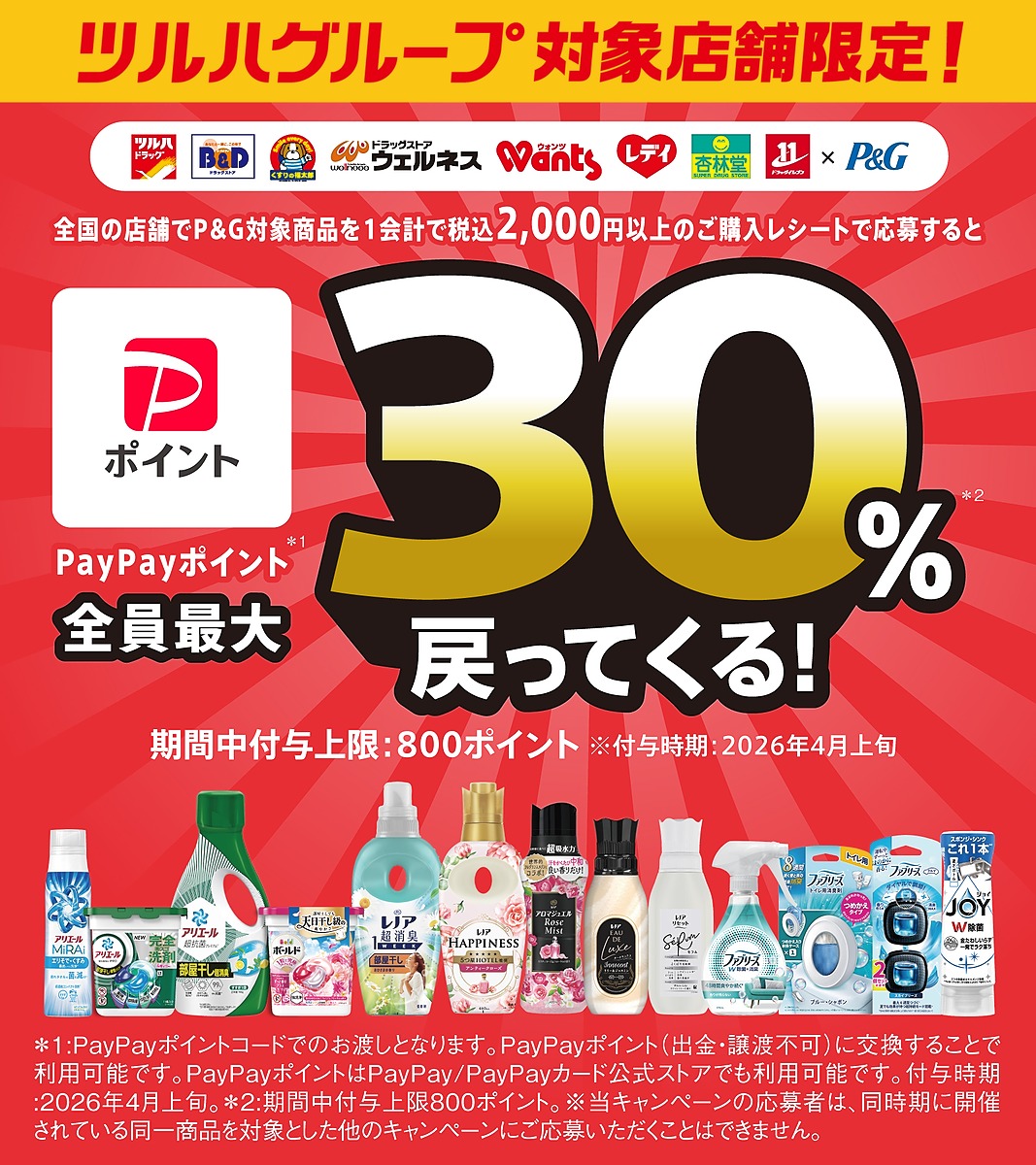 ツルハグループのドラッグストアで1会計2000円以上P&G商品購入で30%paypayポイントバックとなります。