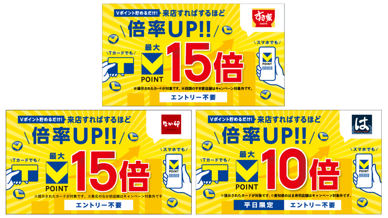 すき家・はま寿司・なか卯でVポイント最大15倍が当たる。11/1~11/30。