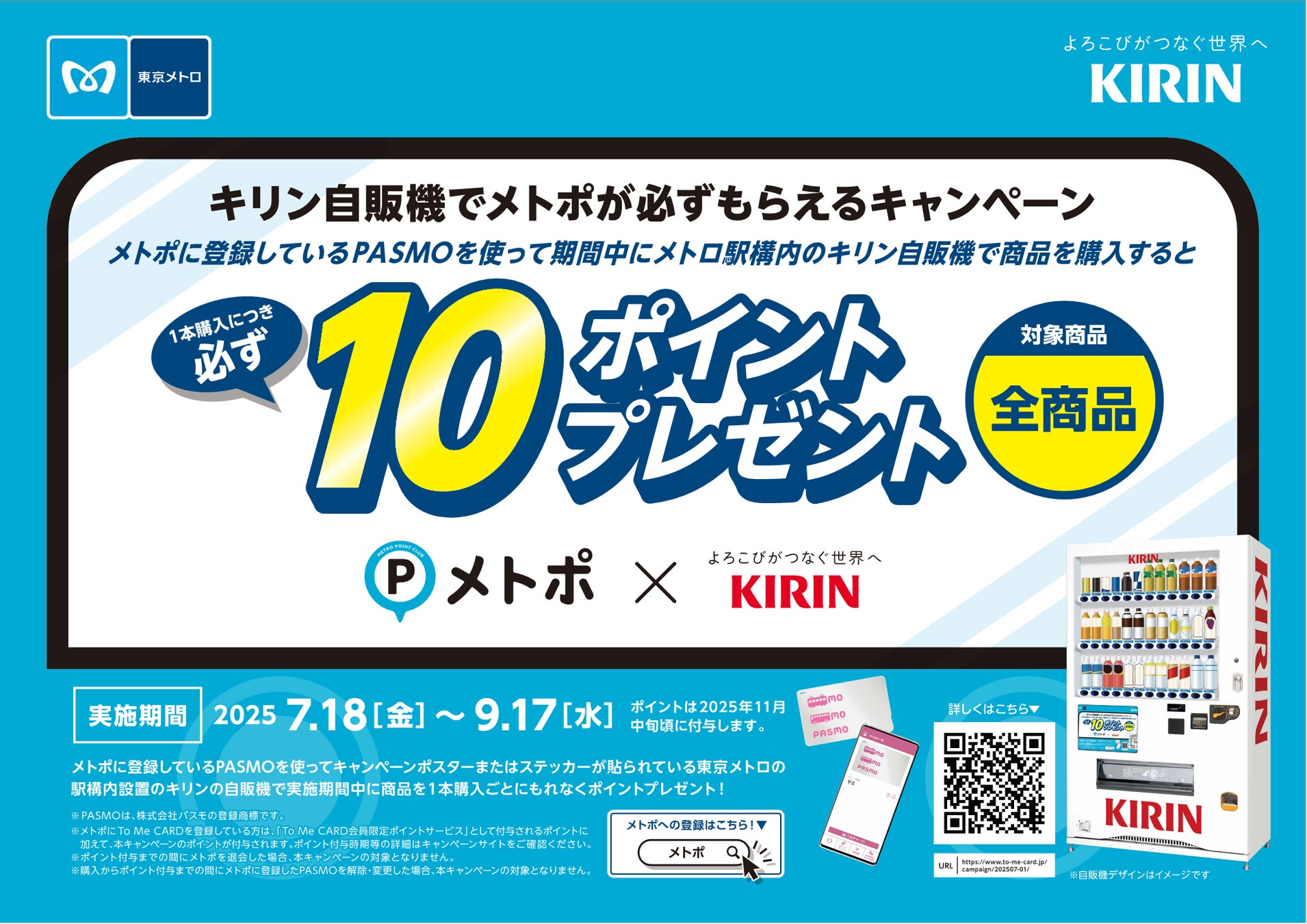 【予告】キリン自販機でPASMO決済すると1本ごとに10メトポがもれなくもらえる。~9/17。