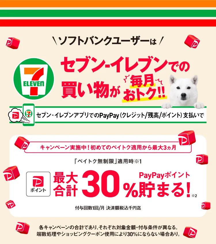 ソフトバンクユーザーはセブン-イレブンでPayPay決済すると10%、ペイトクで最大30%還元キャンペーンを実施中。9/1~。