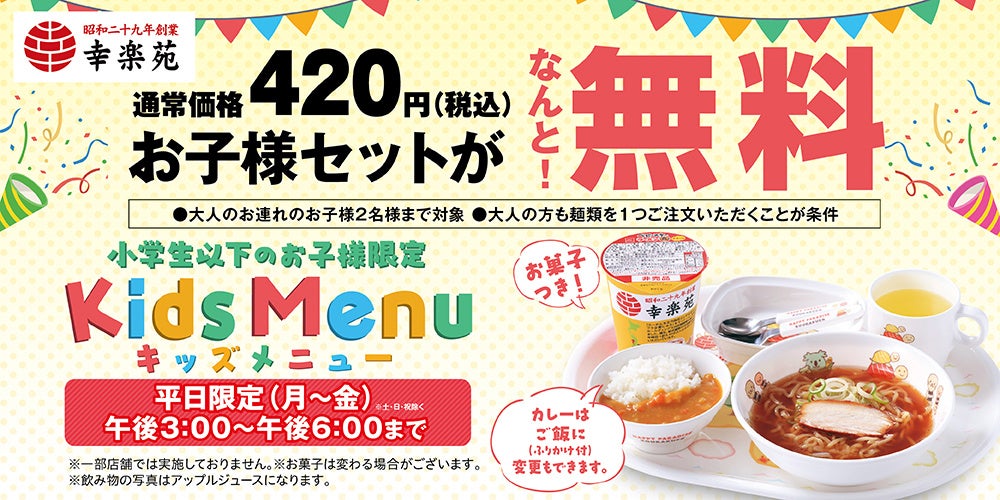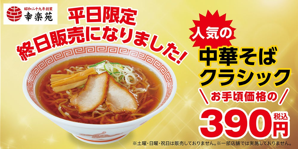 ラーメンの幸楽苑でお子様セット420円が平日限定15-18時で無料に。中華そばクラシックを平日限定で390円で販売へ。11/1~。