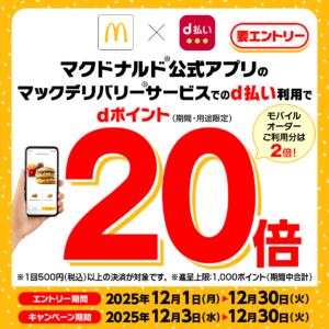 マクドナルドのマックデリバリー・モバイルオーダーでd払いを使うと、dポイントが最大20倍貰える。~12/30。