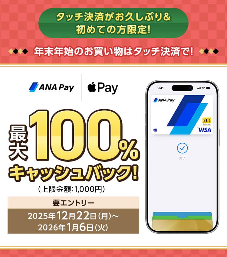 - 2025年10月22日~2025年12月21日の期間に、ANA PayのApple Payタッチ決済(iD決済・Visaのタッチ決済)利用履歴がない人