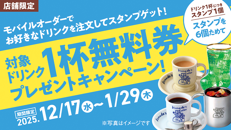 コメダ珈琲でドリンク6杯注文で1杯無料。~2026/1/29。