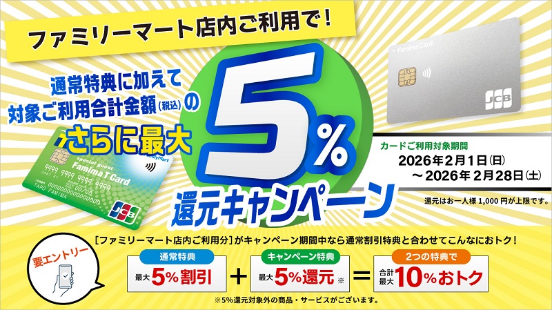 ファミリーマート店内でファミマカードのクレジット払いをすると、通常特典5%割引に加えて+5%還元、
